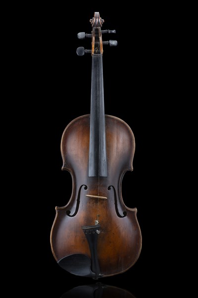 One-piece back without curl, varnish of a brown-red colour, in good condition, without label (lenght of the back mm 357) With case, a violin bow and a 3/4 violin bow