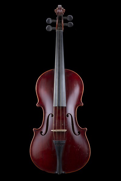 Two-piece back with narrow curl, varnish of a red-violet colour, in perfect condition, without label (lenght of the back mm 390). With case and a viola bow
