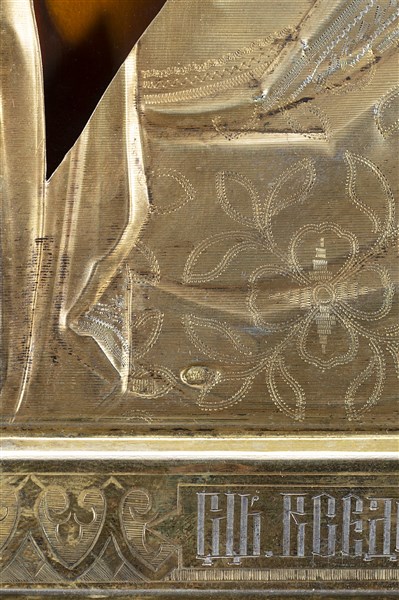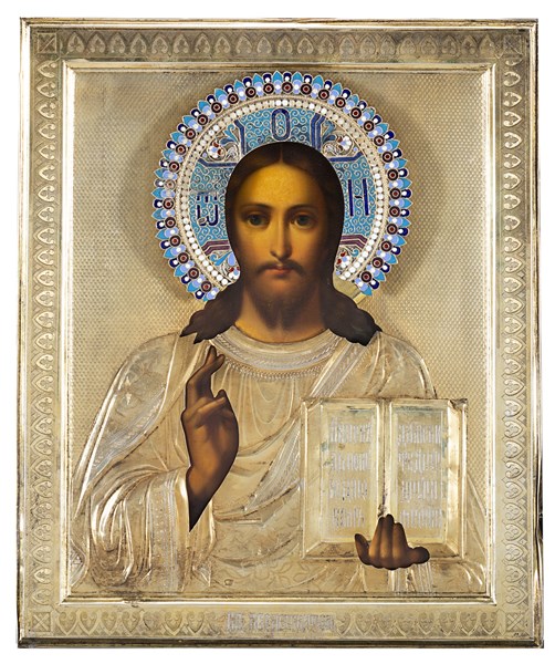 Arte russa, fine secolo XIX "Cristo pantocratore" icona ad olio su tavola con riza in vermeille e aureola in smalti policromi. Marchi di difficile lettura (cm 27x22,5) (difetti e mancanze)
