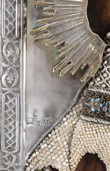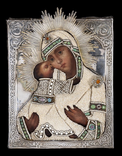 Arte russa, seconda metà del secolo XIX. Icona ad olio su tavola raffigurante Madonna con Bambino con riza in argento e vermeille sbalzata a motivi stilizzati e inscrizioni in cirillico, vesti decorate con perle, madreperla, smeraldi, turchesi, ametiste e paste vitree (cm 28x22) (lievi difetti)