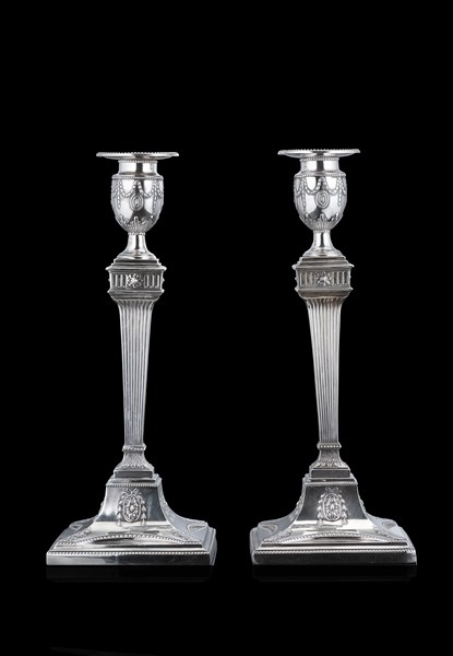 Coppia di candelieri in argento con fusto centrale a colonna scanalata su base squadrata perlinata sbalzata a foglie e festoni. Punzoni della città di Sheffield, 1901. Argentiere Hawsworth Eyre & Co Ltd (h. cm 31) (g lordi 1845) (difetti)