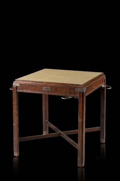 Tavolo da gioco di forma rettangolare con porta posaceneri a scomparsa e applicazioni in ottone sui montanti e nei piedi. Targhetta inscritta "Corrientes Buenos Aires 1891" (cm 73x72x70) (lievi difetti)