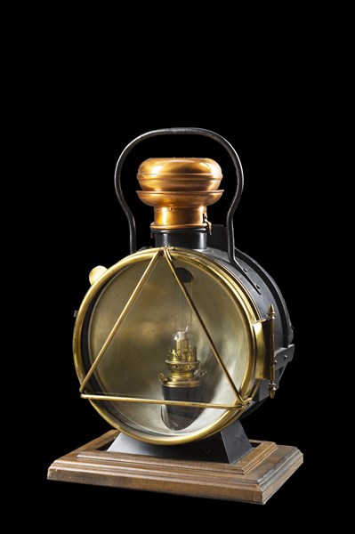 Grande lanterna da marina in ottone, rame e metallo verniciato. Seconda metà secolo XX (h. cm 54) (difetti)
