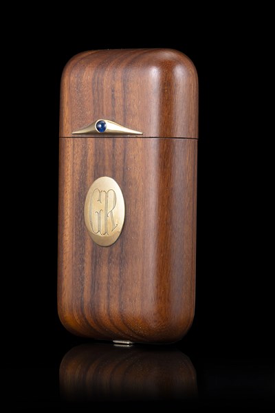 Lotto 365 | Scatola portasigari in legno con losanga e bottone in oro monogrammato "GR" e p