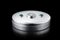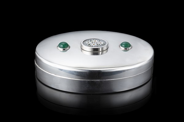Scatola con coperchio in argento decorata da due cabochons verdi e centrata da