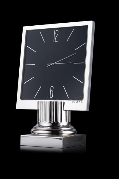 BULGARI Orologio da tavolo in argento titolo 925 su base a colonna scanalata. Q
