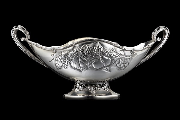 Centrotavola in argento con corpo sbalzato a foglie e frutti. Anse e base traforate e decorate a foglie di vite. Titolo 800, Firenze. Argentiere Alvignani & Galeotti (cm 39,5x18,5x18) (g 800)