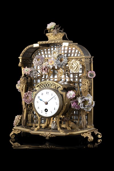 Orologio da appoggio con cassa in bronzo guarnita da decori floreali in porcellana policroma.