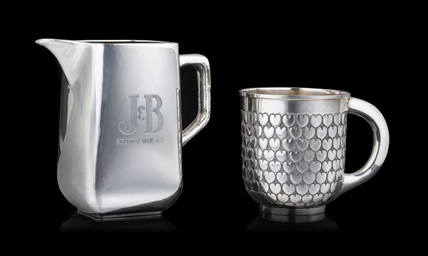 Lotto composto da una tazza sbalzata a cuori e una brocca da acqua ad un'ansa in argento marcata J&B. Titolo 800 (h. max cm 15) (g 825) (lievi difetti)