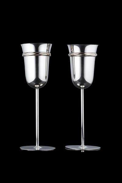 Due calici in argento con corpo liscio decorato da motivo a corda intrecciata color oro e oro-rosa. Titolo 925. Argentiere Cartier (h. cm 21) (g 360)
