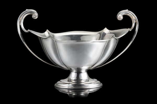 Centrotavola biansato in argento con corpo costolato e piede scanalato. Punzoni