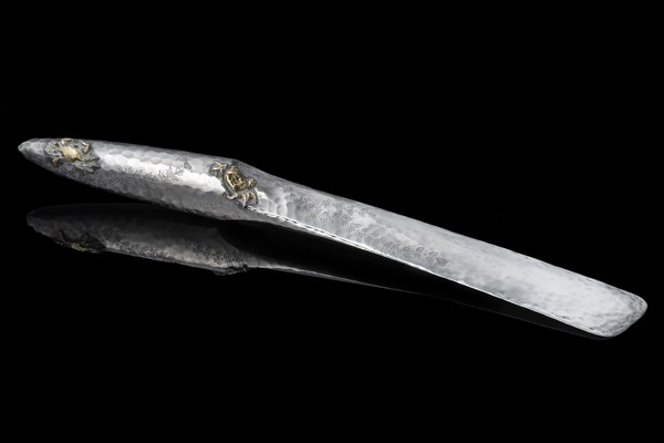 Tagliacarte in argento martellato e inciso a motivo vegetale e granchi in rilie