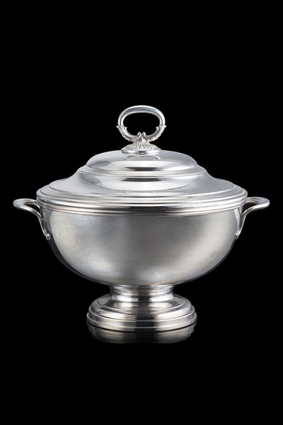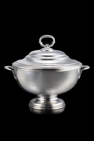 Zuppiera biansata con coperchio in argento a corpo liscio con bordi scanalati,
