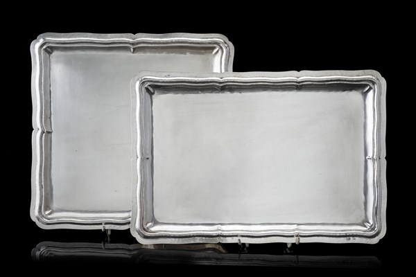 Lotto composto da due vassoi in argento con bordo mosso di misure differenti. Titolo 800. Argentiere Jacomino Ciro, Napoli, seconda metà secolo XX (cm max 40x28) (g 2200) (difetti)