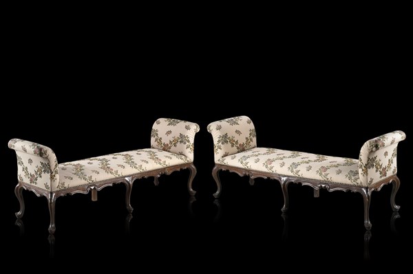 Coppia di panchetti in legno intagliato a volute e conchiglie nella fascia, braccioli e gambe mosse. Secolo XVIII (cm 180x75x60) (difetti e restauri)