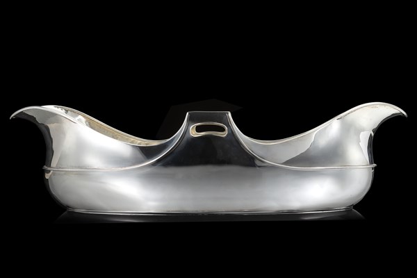 Centrotavola in argento liscio di forma sagomata a due prese con interno martel