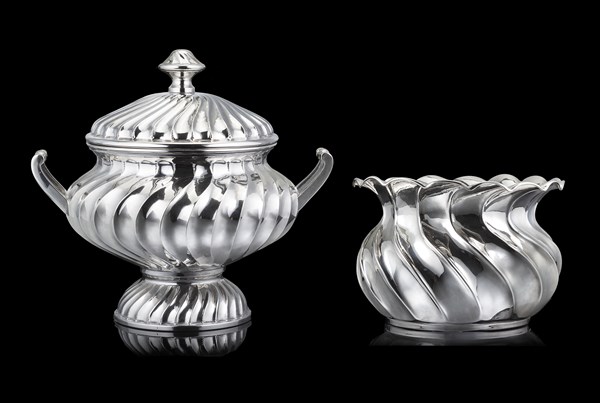 Lotto composto da una zuppiera biansata con coperchio e un sottovaso in argento