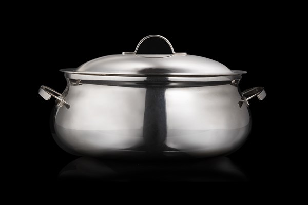Zuppiera biansata in argento liscio, anse e presa sagomate. Titolo 800. Alessan