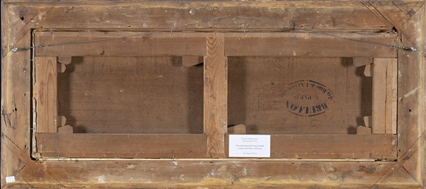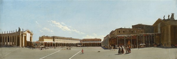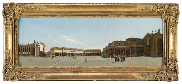 French master of XIXth Century in Rome " "Papal procession of Corpus Domini in St. Peter's Square" oil on canvas (33x93 cm) On the back: cartouches and stamp. Provenance: Paolo Antonacci Antichità, Rome. In the frame of the time.
