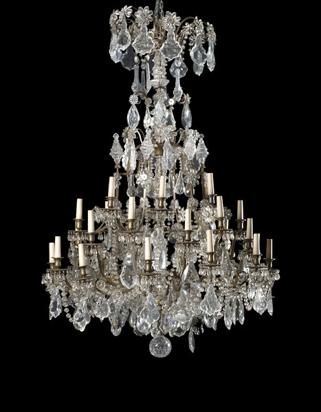 Grande lampadario a trenta luci con struttura in bronzo dorato, collane e pendenti in cristallo. Secolo XVIII (h. 165 ca.) (difetti)