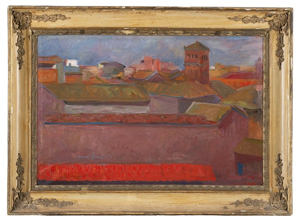 "Tetti da San Michele" 1957, oil on canvas. Signed and dated lower right and lower left (54x81 cm). Framed (defects)