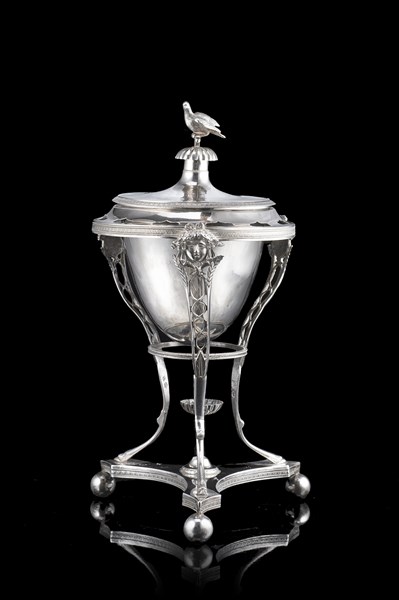 Zuccheriera tripode in argento con sostegni traforati cesellati a mascheroni all'attacco, piedi ferini poggianti su base a mensola, presa del coperchio a guisa di rapace a tutto tondo. Parigi, fine secolo XVIII/ inizio secolo XIX. Argentiere A.H. (?) (h. cm 27) (g 540) (difetti)