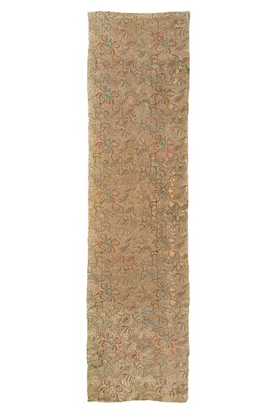 Tessuto in garza di cotone stampata con plance in legno a motivi floreali. Fondo ramato tramite apposizione di colla di coniglio e polvere Metallica color rame. Europa, inizio secolo XX, transizione del Liberty (cm 250x67,5) (difetti, piccoli buchini)