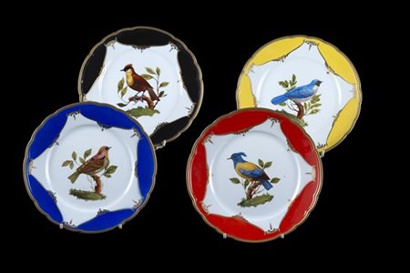 Manifattura di Vienna, secolo XX. Gruppo di quattro piatti in porcellana a bordo dorato mistilineo decorati in policromia a volatili. Marcati al retro (d. cm 24,2) (lievi difetti)