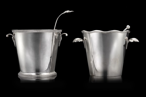 Lotto composto da due secchielli biansati portaghiaccio con filtro removibile e mestolino a corpo liscio in argento. Titolo 800. Uno marcato Stefani, Bologna (h. max cm 13) (g 900) (lievi difetti)