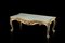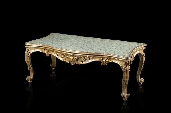 Tavolo basso di forma mossa in legno intagliato e dorato, fascia a volute e fiori, gambe terminanti a ricciolo. Piano decorato da un tessuto sotto vetro dell'Impero Ottomano del XVIII/XIX secolo, ricamato in fili d'argento dorato su fondo seta marezzata color celestino pallido raffigurante fiori e melograni (cm 114x40x54,5) (difetti)