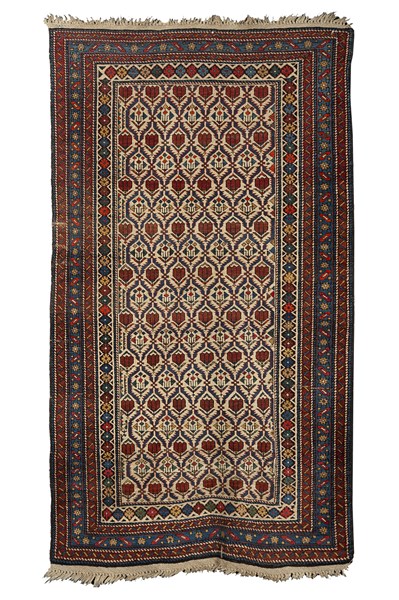 Daghestan rug, Caucasus, early 20th century. Blue grid decoration on white background with reserves containing stylized flowers. (cm 219x122) (Defects)