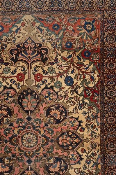 Sarouk rug, Persia, early 20th century. Decorated with polylobed medallion in shades of pink, tobacco and blue on a beige background. Corners decorated with flowering vases on a brick background (cm 196x131) (Defects and slight deficiencies)
