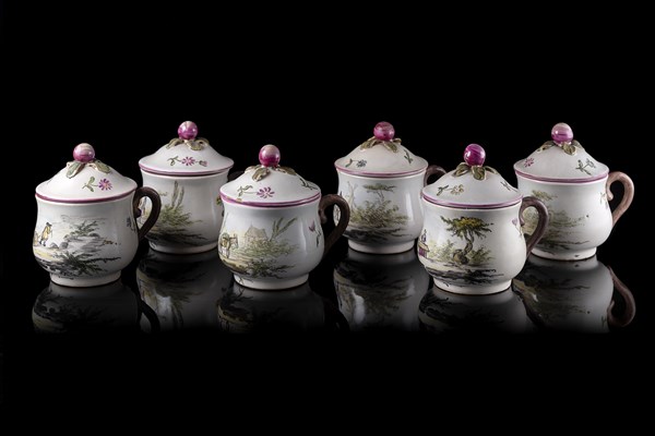 Manifattura di Veuve Perrin, Marsiglia, secolo XVIII/XIX. Gruppo di sei cremiere con coperchio in maiolica decorata in policromia a scene di genere, presa del coperchio a frutto. Siglate alla base in rosso ferro "VP" (difetti)