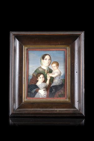 Scuola italiana, secolo XIX "Ritratto di famiglia" miniatura rettangolare su avorio (cm 11x9) In cornice (difetti e restauri)