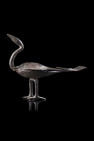 Lucerna in forma di volatile in ferro battuto. Secolo XVIII (largh. cm 8) (difetti)