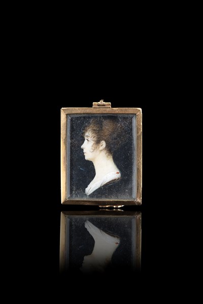 (attr.) "Ritratto di dama di profilo" miniatura su avorio (cm 3,5x2,8) In cornice a pendente in oro 18K