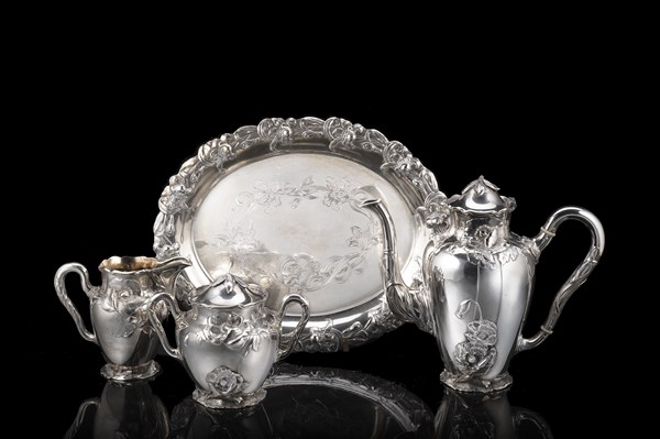 A silver coffee set composed of tray, coffee pot, milk jug and sugar bowl. Title 800, silversmith "HEINR.MASS" (g 1900) (minor defects)