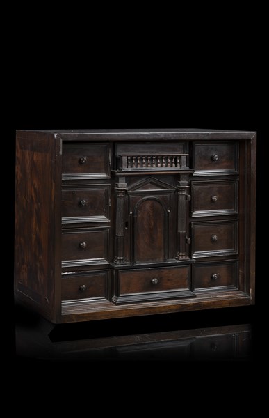 Stipo lastronato in legno ebanizzato con fronte a otto cassetti e parte centrale di forma architettonica con colonne scanalate che sorreggono timpano e ringhiera con colonnine a tutto tondo. Anta celante cassettini interni. Secolo XVII (cm 59x50x34,5) (mancanze e restauri)