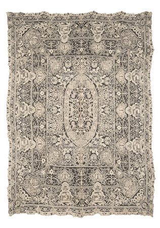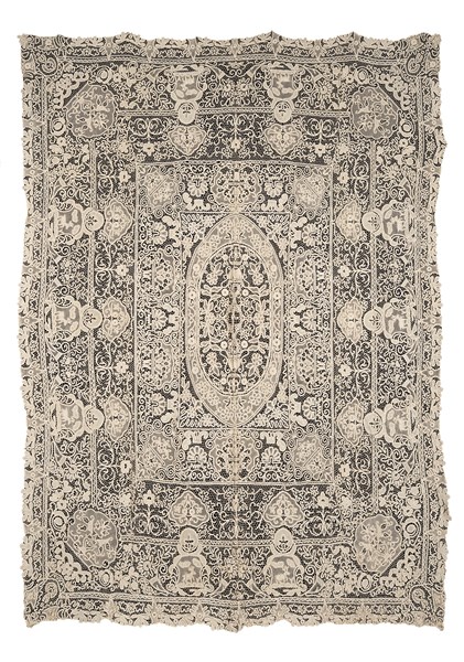 Tablecloth entirely worked in Cantù lace in pearl cotton, composed of a central oval medallion and various reserves in which deer are depicted. 19th-20th century (cm 264x194) (Slight defects)