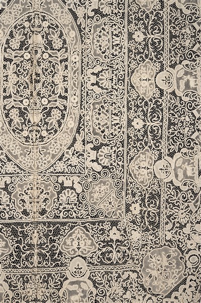 Tovaglia interamente lavorata in pizzo di Cantù in cotone perlè, composta con un medaglione centrale ovale e varie riserve in cui sono raffigurati dei cervi. Secolo XIX/XX (cm 239x175) (lievi difetti)