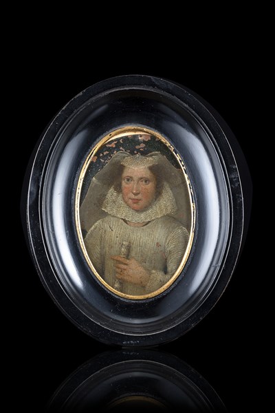 Maestro lombardo del secolo XVI "Ritratto di dama in abito bianco" miniatura ovale su rame (cm 9x7) Inscritta al retro "donato dal Padre Riva priore della fontana" In cornice ebanizzata (difetti)