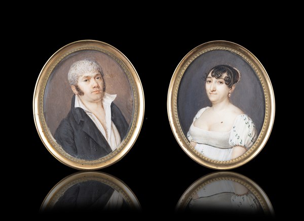 Maestro del secolo XIX "Gentiluomo e gentildonna" coppia di miniature ovali su