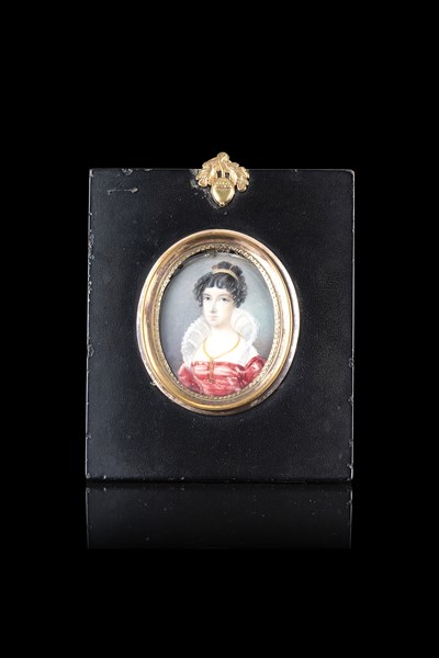 (attr.) "Ritratto di dama con abito rosso" miniatura ovale su avorio (cm 6x5) Siglata "H.C." a sinistra. In cornice