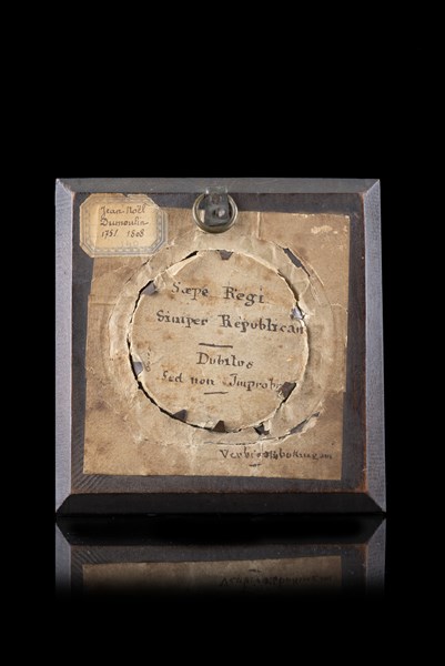 Monogrammista RD (secolo XVIII/XIX) "Ritratto di Jean Noel Dumolin (1751-1808)" miniatura tonda su avorio (d. cm 6) Siglata e inscritta "AN II" a destra. Inscrizione al retro "Saepe Regi Simper Republican- Dubitus sed non Improbitos- Verbigrafia bukingram (?)". In cornice