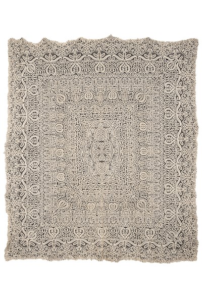 Tovaglia interamente lavorata in pizzo di Cantù con volute formate dalle serpentine tipiche della provenienza. Medaglione centrale polilobato. Secolo XIX/XX (cm 190x185) (lievi difetti)