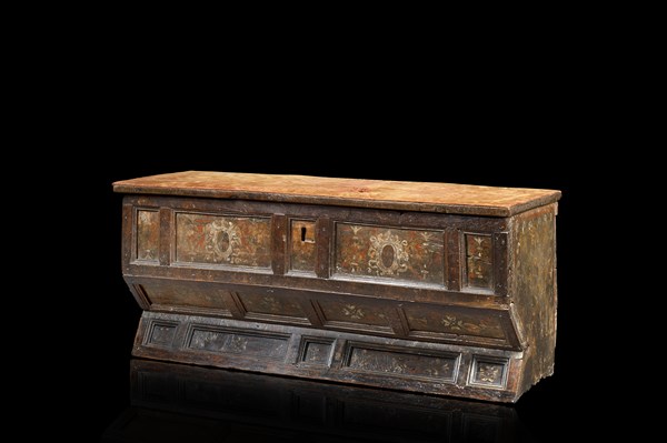 Piccola cassapanca con fronte pannellato dipinto in policromia a stemmi. Secolo