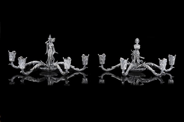 Coppia di candelieri a quattro fiamme in argento con braccia cesellate a volute