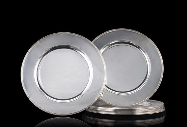 Gruppo di dodici sottopiatti in argento liscio e tesa scanalata. Titolo 800 (d.