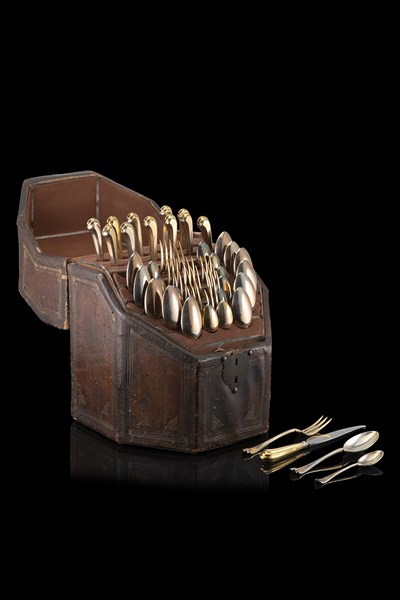 Servizio di posate da dodici in metallo argentato, composto da coltelli, cucchiai, cucchiaini e forchette. In custodia in pelle impressa. Secolo XVIII