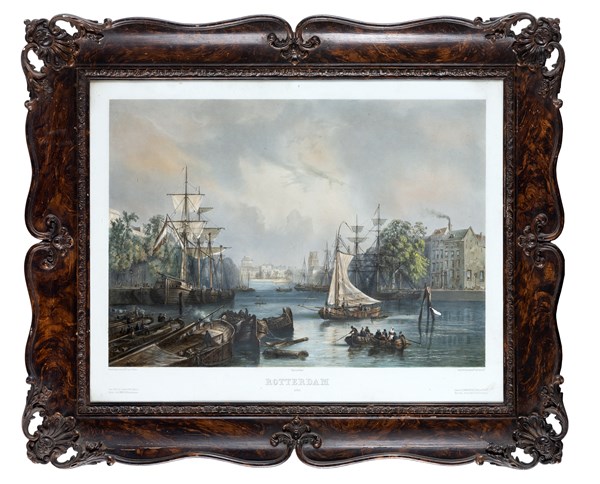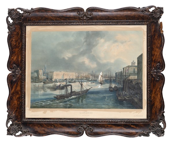 Coppia di incisioni acquerellate del secolo XIX raffiguranti il Porto di Londra e il Porto di Rotterdam (mm 500x600) Edizioni Bulla e Jouy da Léon Jean-Baptiste Sabatier. In cornici coeve in legno e pastiglia laccata (difetti)
